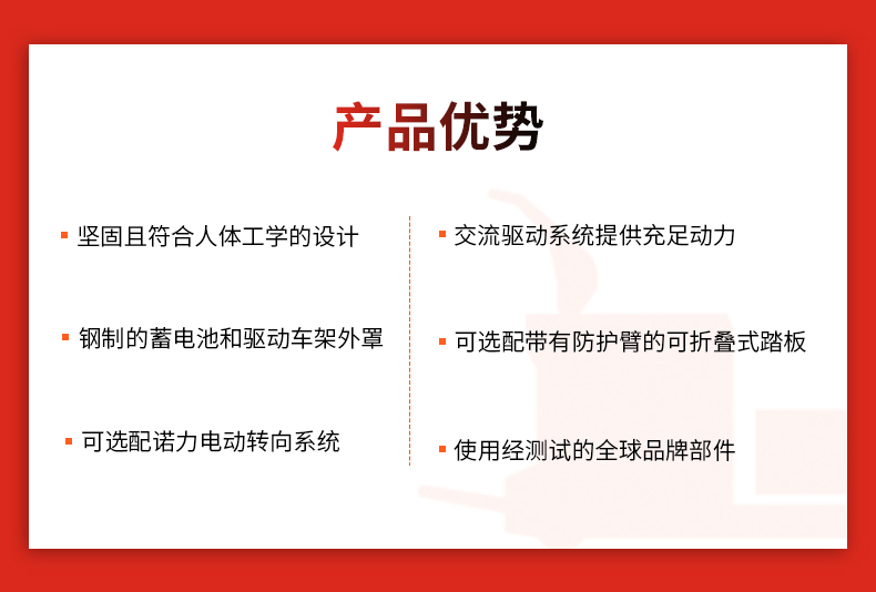 主要特點(diǎn) ·交流驅(qū)動(dòng)系統(tǒng)。 ·具有CAN-BUS總線技術(shù)且符合人體工學(xué)的手柄。 ·鑰匙開關(guān),急停開關(guān)和蓄電池電量表。 ·鋼制蓄電池和驅(qū)動(dòng)車架外罩。 ·可選配典型美式帶短貨叉頭的貨叉架。 ·可選配帶有防護(hù)臂的懸浮可折疊式踏板。