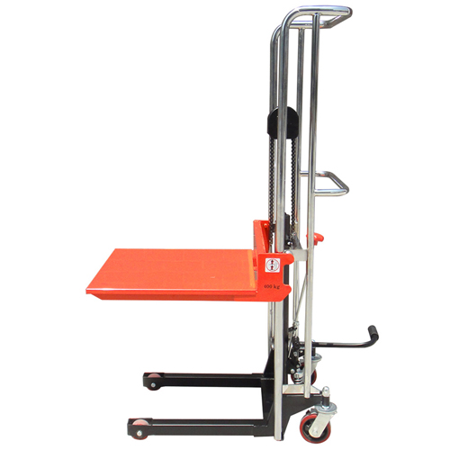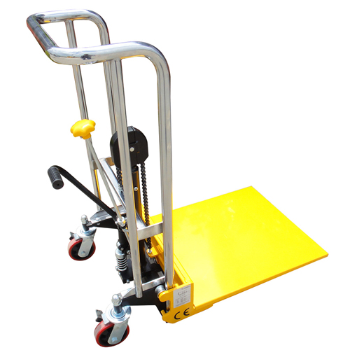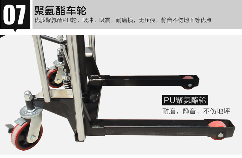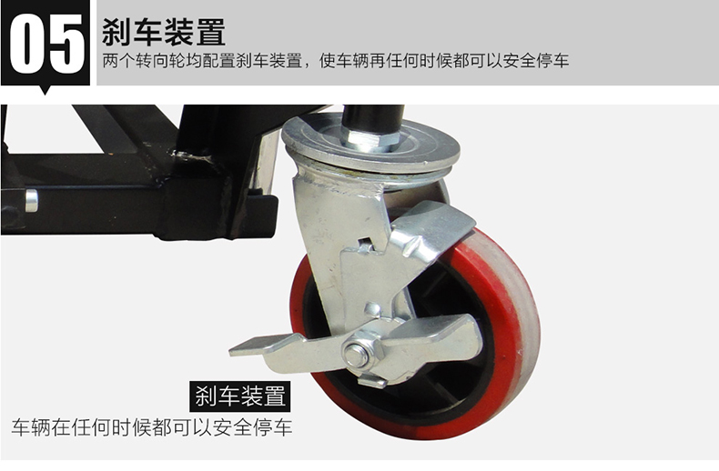 旋轉手動閥使平臺下降,帶剎車轉向輪,橡膠輪胎。