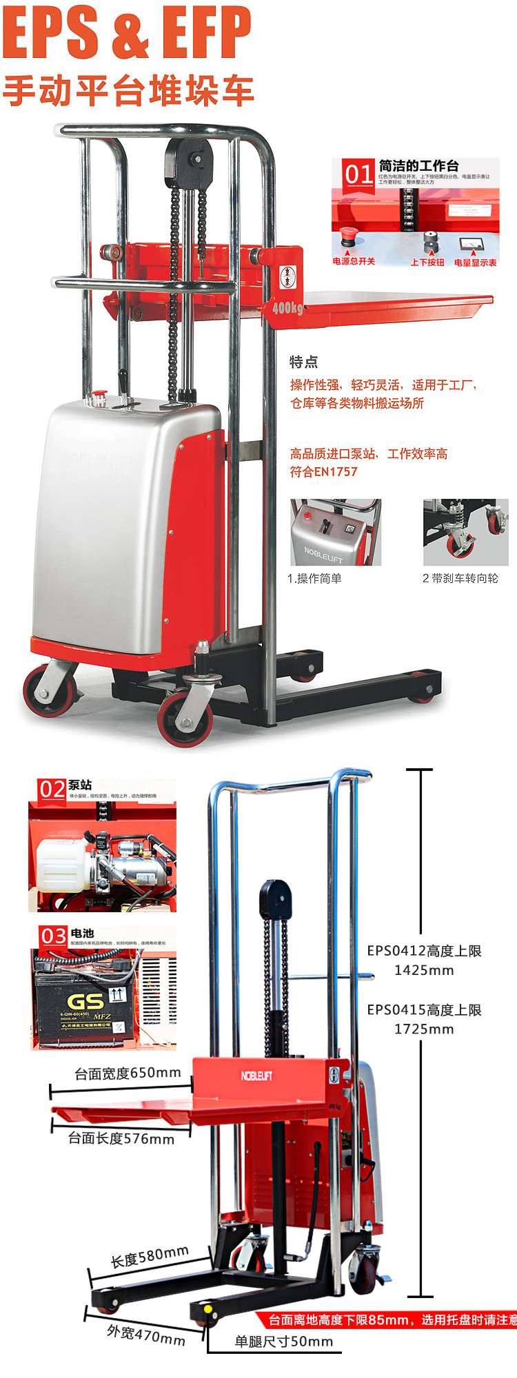 ? 回轉(zhuǎn)半徑小,操作輕巧靈活,電動提升,帶剎車轉(zhuǎn)向輪。