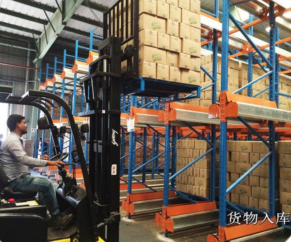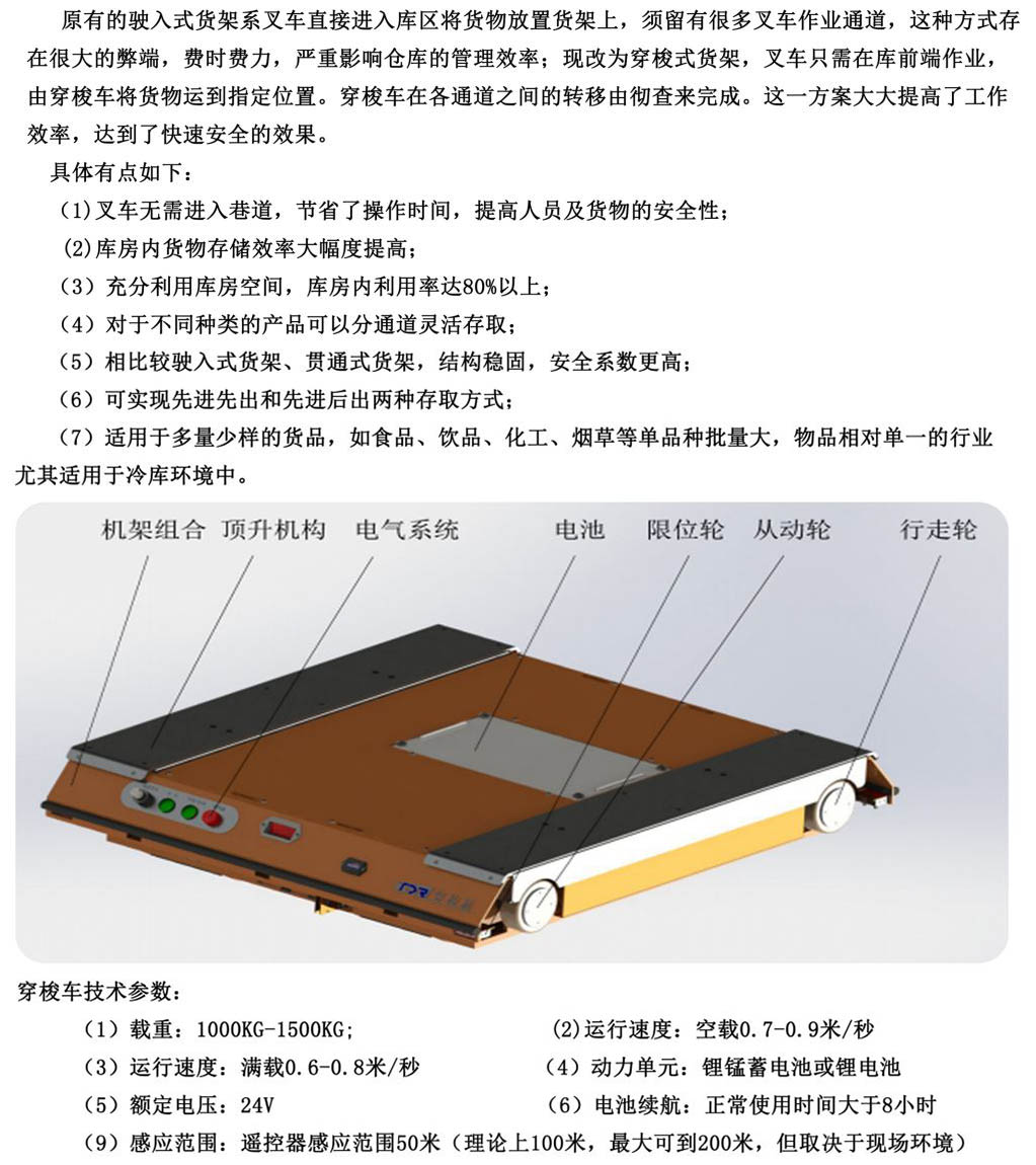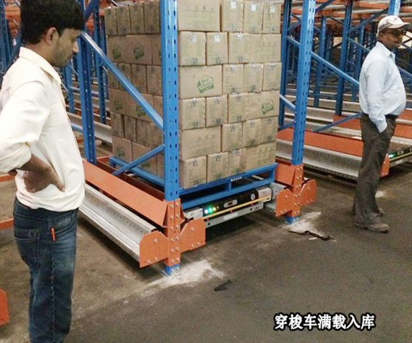 穿梭式貨架是穿梭板結(jié)合人工叉車一起操作使用,把貨物的存放和運輸分開,通過無線遙控穿梭車完成貨物的存取功能;人工叉車完成貨物運輸功能。叉車不進(jìn)入貨物存放區(qū),只在存儲區(qū)端頭作業(yè),靠穿梭車將貨物放入指定貨位。貨物存放指令由叉車操作員通過無線遙控器下發(fā),操作員也可終止無線遙控穿梭車正在執(zhí)行的動作。貨架端頭的第一貨位就是叉車取放貨物的位置,可實現(xiàn)貨物的先進(jìn)后出兩種作業(yè)模式。