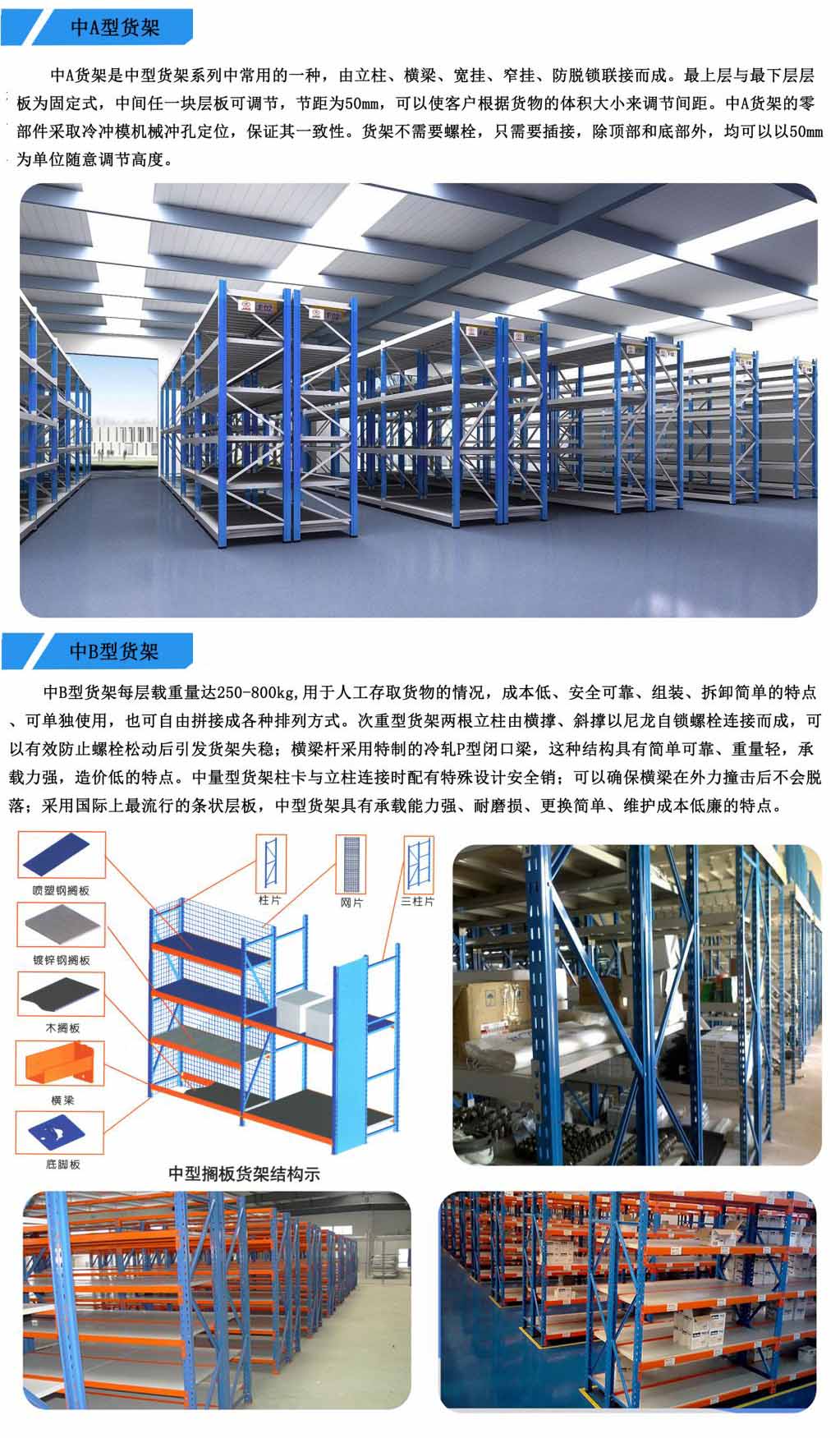 架之間,故名中型貨架。通常貨架承載150kg/-500kg層(貨架載荷絕