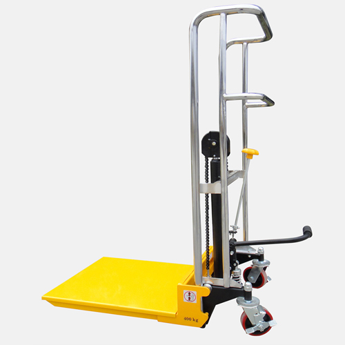 旋轉手動閥使平臺下降,帶剎車轉向輪,橡膠輪胎。