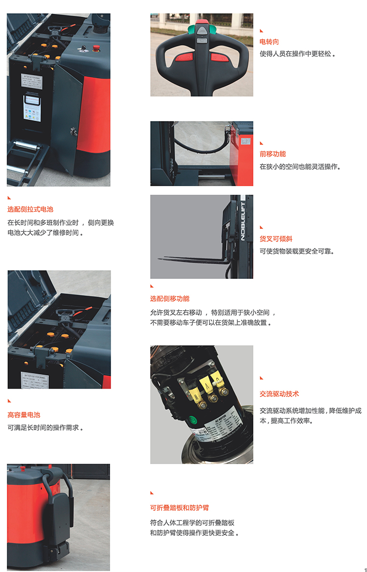· 貨叉可傾斜 可使貨物裝載更安全可靠。同時(shí)貨叉與托盤架的分開也更加簡單 |