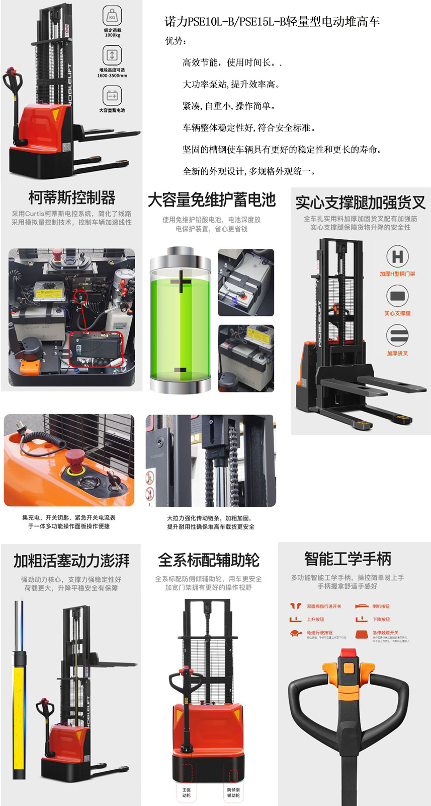 ? 諾力PSE10L-C、PSE15L-C是一款輕量型電動堆垛車,堆垛高度1600-3600mm