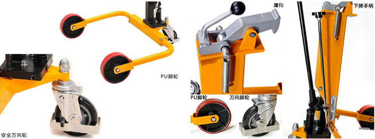 ?通過一個特制液壓油缸輕松的腳踩起升,起升時鷹嘴有自動抓取和鎖緊的功能,放下油桶會自動打開。