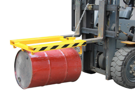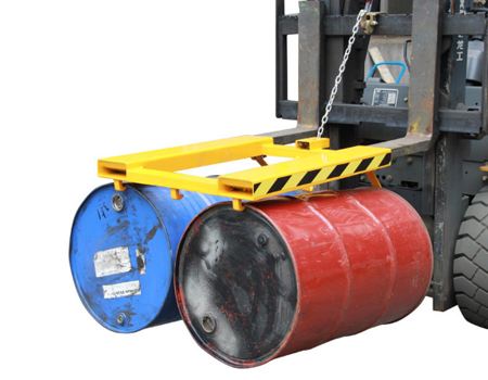 ? 純機械機構(gòu)設(shè)計,僅依靠叉車動作,一次可搬運、堆碼、裝卸1-2個水平方向的桶。
